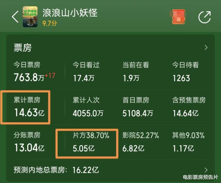 《浪浪山小妖怪》目前累计票房14.6亿,预测最终落点16亿,分账票房狂赚5亿,而它的总成本仅只有3000万。