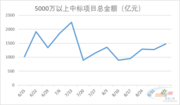 据中国水泥网水泥大数据研究院不完全统计,2025年9月1日~2025年9月7日全国重大建筑工程项目(中标金额>5000万)中标数量共489个,较前一期减少36个,中标总金额为1473.22亿元。