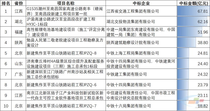 从中标项目金额排名看,江西的G1535潮州至南昌国家高速公路南丰(赣闽界)至南昌段新建工程项目第一批以67.81亿元位居第一,湖北的沪渝高速公路武汉至宜昌段改扩建工程HYJC-1标段以62.16亿元位居第二,福建的高性能锂电池基地建设项目(施工“评定分离”)建设项目以51.96亿元位居第三。
